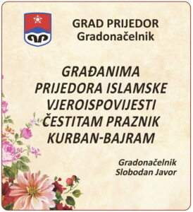 Svim građanima Prijedora islamske vjeroispovijesti čestitam praznik Kurban-bajram sa željom da praznične dane provedete u lijepom raspoloženju i blagostanju kao i da radost praznika podijelite sa svojom rodbinom, komšijama i prijateljima.