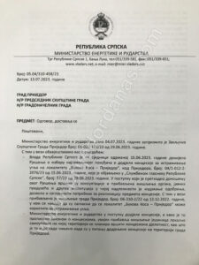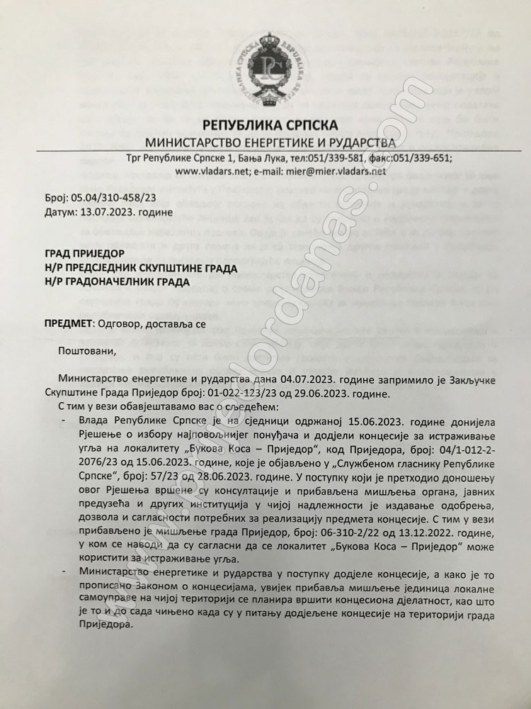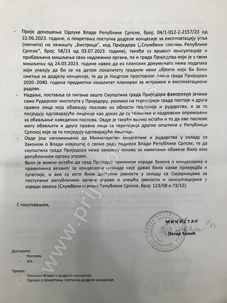 “Ovde još napominjemo da Ministarstvo energetike i rudarstva u skladu sa Zakonom o Vladi izvještaj o svome radu podnosi Vladi Republike Srpske, te da skupština grada Prijedora nema zakonsku osnovu za nametanje obaveze bilo kom republičkom organu uprave”, stoji u dopisu ministra Petra Đokića upućenom 13. jula gradonačelniku i predsjedniku Skupštine grada Prijedora.