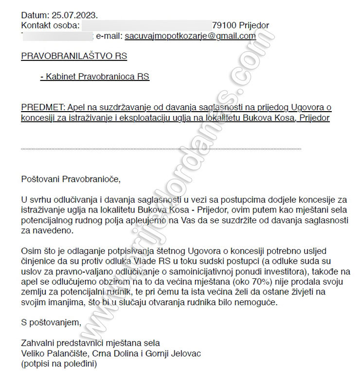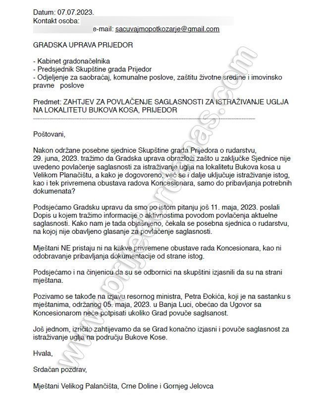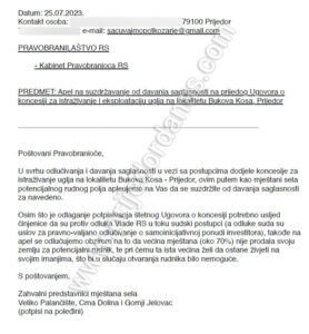 Ministar piše i da je Vlada Republike Srpske 15. juna donijela Rješenje o izboru najpovoljnijeg ponuđača i dodjeli koncesije za istraživanje uglja na lokalitetu Bukova kosa i podsjeća da je tome prethodilo i pribavljanje mišljenja grada Prijedora od 13. decembra 2022. u kojem se navodi da su saglasni da se lokalitet Bukova kosa može koristiti za istraživanje uglja.