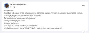 “Hvala Vam! Autobus od druge firme je(ukraden) sa parkinga pumpe. Pritom je udario u auto našeg vozača. Nama je javljeno da je naš autobus ukraden! Taj bus je imao udes prema Prijedoru! Policijska akcija je u toku. Upravo javljeno… Lice koje je ukralo autobus je uhapšeno! Hvala Vam svima, i firma ‘VIVA TRAVEL’ se izvinjava na uznemiravanju!”, naveli su na Facebooku iz “Viva travela”.