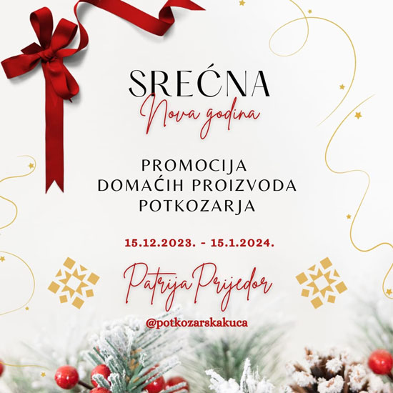 Obavještavamo sve ljubitelje proizvoda “Potkozarska kuća” da će ista u periodu od 15.12.2023. do 15.01.2024.godine imati promotivni prostor na lokaciji tržnog centra “Patrija”u centru Prijedora.