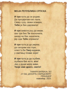 Učenica Osnovne škole “Dositej Obradović” iz Prijedora, Tamara Bilbija, sa pjesmom “Moja Republika Srpska” pobijedila je na konkursu za literarne radove učenika osnovnih škola, koji je, povodom Dana Republike, organizovao Republički pedagoški zavod.