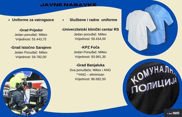 Za samo dvije godine banjalučka firma „Miltex“ dobila je 30 poslova nabavki vatrogasnih ili radnih uniformi od opština, gradova i javnih institucija u Republici Srpskoj. Značajan dio poslova kompanija je dobila direktnim sporazumima, dok je u gotovo svim ostalim slučajevima bila jedini ponuđač u otvorenim postupcima ili konkurentskim zahtjevima za javnu nabavku.
