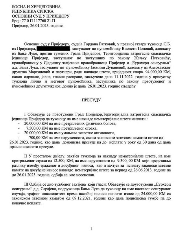 Prema presudi, koju je nedavno potvrdio prijedorski Okružni sud, a koja je u posjedu redakcije našeg portala, Grad Prijedor je dužan da vatrogascu S.B. plati 20.000 KM na ime pretrpljenih fizičkih bolova, 7.500 KM za pretrpljeni strah, 20.000 KM na ime umanjenja životne aktivnosti i 700 KM na ime naruženosti. Grad je dužan da plati i troškove postupka u iznosu od 5.685 KM.