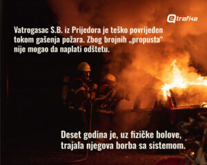 “Nakon povrede Teritorijalna vatrogasno spasilačka jedinica Prijedor nije uradila i izdala ozljedni list, odnosno Izvještaj o povredi na radu, što su bili dužni da urade. Takođe, na lice mjesta je trebalo da izađu protivpožarni i inspektori za zaštitu na radu, ali se ni to nije dogodilo”, priča naš sagovornik.