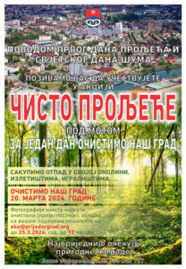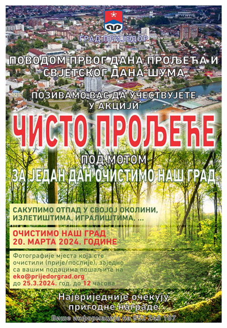 Toga dana na teritoriji grada Prijedora biće organizovana Akcija “Čisto proljeće” čiji je moto “Za jedan dan očistimo naš grad”.