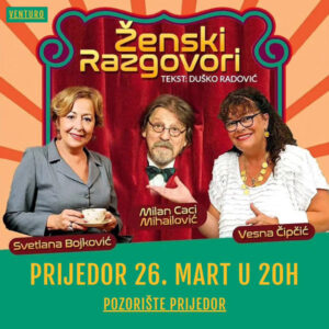 Svetlana Bojković, Vesna Čipčić i Milan Caci Mihailović u kultnoj komediji “Ženski razgovori” koja će biti izvedena ovog utorka, 26. marta u Pozorištu Prijedor u 20 časova.