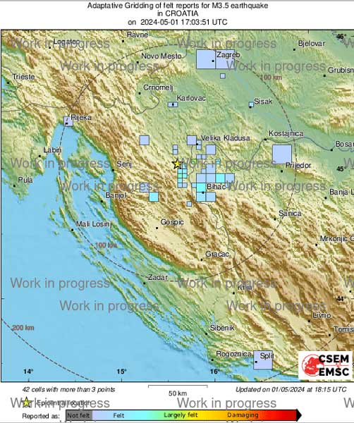 U 19 časova i 3 minute seizmografi Seizmološke službe Republike Hrvatske zabilježili su ponovno prilično jak potres s epicentrom oko 15 km južno od Slunja, magnitude 3.8 prema Richteru, izvijestila je večeras Seizmološka služba Republike Hrvatske.