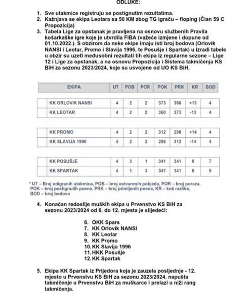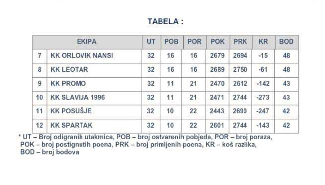 To znači da je Prijedor-Spartak zauzeo posljednje 12. mjesto i napušta elitni rang bh. košarke nakon jedne sezone u njemu, a Posušje na mala vrata ostaje član takmičenja.