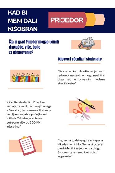 Na pitanje šta bi grad Prijedor mogao učiniti drugačije, više, bolje za obrazovanje, neki srednjoškolci kažu da bi željeli da nastavu fizike i hemije imaju u kabinetima opremljenim laboratorijama i da na fizičko ne moraju ići na stadion.
