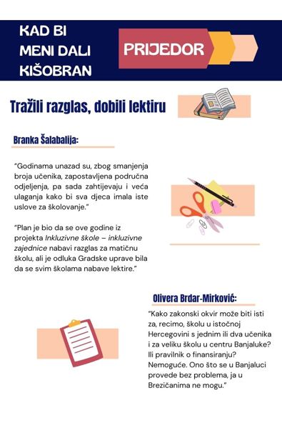 Branka Šalabalija takođe smatra da se favorizuju gradske u odnosu na prigradske i seoske škole. Tako je i u informaciji o školskoj 2022/2023, koju je usvojila Skupština Grada Prijedora (ona za 2023/2024. u programu je lokalnog Parlamenta za posljednje tromjesečje ove kalendarske godine), napisala: Nipošto ne odvajati gradske škole od prigradskih, kao ni područne škole od centralnih. Istim intenzitetom ulagati u opremanje učionica i kabineta.