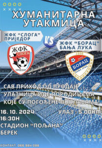 ŽFK “Sloga” igraće sa ŽFK “Borac” Banjaluka u srijedu humanitarnu utakmicu, a sav prihod od ulaznica namijenjen je za porodice u BiH koje su pogođene poplavama početkom mjeseca.