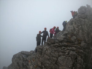 Uz lagani tempo i povremene pauze stižemo do vrha Skala na 2882 m. Kratka pauza, stavljanje šljemova i polazak na izloženi dio staze prema Mitikasu. Stijena je još dijelimično mokra od sinoćnje kiše, ali uz dovoljno pažnje prolazak nam ne predstavlja problem. Na žalost, dobar dio uspona se nalazimo u oblaku pa nam je vidik značajno skučen. Doduše, to je za neke od nas i olakšavajuća okolnost, jer oni manje iskusni i ne vide svu izloženost staze i lakše prolaze takve dionice s pogledom koji seže jedva nekoliko metara ispred.