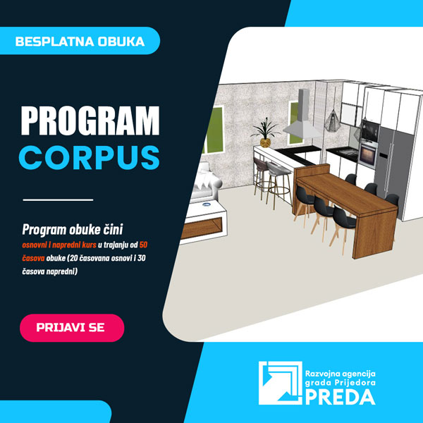 Razvojna agencija grada Prijedora „PREDA“ u okviru gradske mjere „Kreiranje i izvođenje programa obuke i prekvalifikacije prema aktuelnoj potražnji na tržištu rada“ (u daljem tekstu: Projekat), finansirane iz Budžeta Grada Prijedora, organizuje obuku za rad u programu Corpus (software za dizajniranje i izradu namještaja). Projekat se realizuje u partnerstvu sa Gradom Prijedorom i Odjeljenjem za privredu i preduzetništvo.