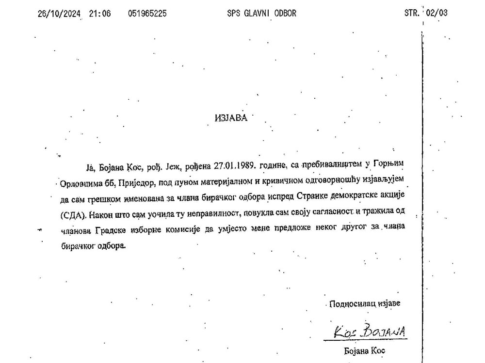 1.10.2024. SPS dostavlja CIK-u izjašnjenje da je Bojana Kos greškom predložena za članstvo u biračkom odboru i da je odmah po prijavi koju je putem CIK-a BiH dostavila nevladina organizacija „Pod lupom“ uočila potencijalnu nepravilnost, povukla svoju saglasnost za rad u biračkom odboru i tako spriječila nepravilnost.