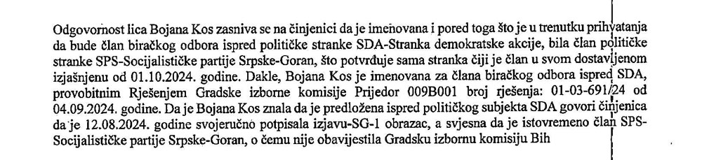 1.10.2024. SDA dostavlja CIK-u izjašnjenje da ni centrala ni prijedorski odbor stranke nisu imali saznanja da Bojana Kos nije mogla biti imenovama, da je član bilo kojeg političkog subjekta, da je bila na bilo kakvim listama niti da je u sukobu interesa.