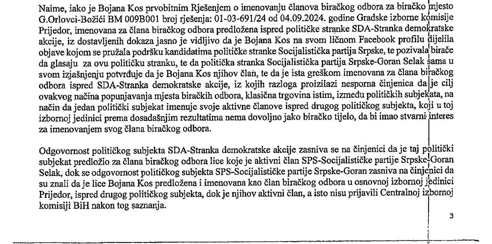 26.10.2024. SPS i SDA ulažu žalbe na odluku CIK-a Apelacionom odjeljenju Suda BIH. Žalba SPS-a sadrži i papir s potpisom Bojane Kos koja navodi da pod punom materijalnom i krivičnom odgovornošću izjavljuje da je greškom imenovana za člana biračkog odbora ispred SDA i da je, nakon što je uočila tu nepravilnost, povukla svoju saglasnost i tražila od članova GIK-a da umjesto nje predlože nekog drugog za člana biračkog odbora.