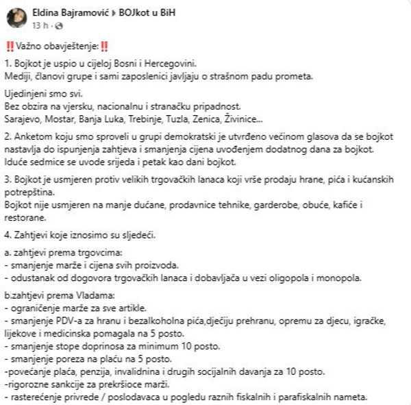 “Hvala vam na zajedništvu i odlučnosti! Zajedno smo pokazali da možemo stati u odbranu svojih prava i jasno poslati poruku trgovcima i vlastima da nećemo šutjeti dok cijene osnovnih životnih namirnica rastu bez kontrole”, stoji u objavi na stranici BOJkot BiH.