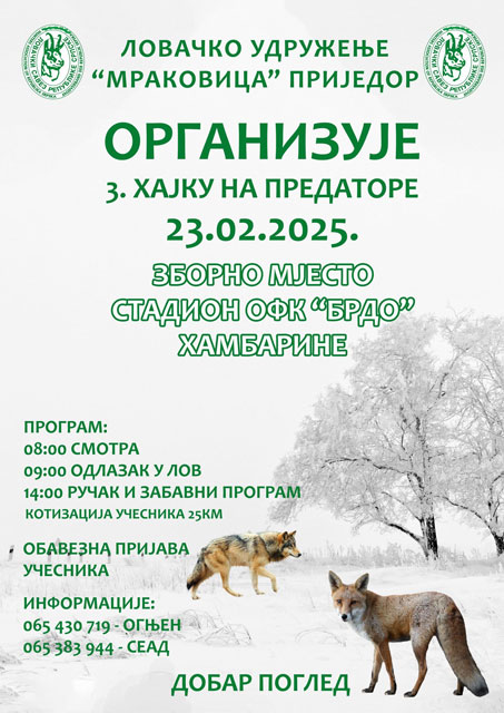Lovačko udruženje “Mrakovica” iz Prijedora ove nedjelje, 23. februara 2025. godine, organizuje 3. hajku na predatore.
