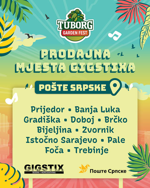 Podsjećamo, jednodnevne ulaznice možete nabaviti za samo 25 KM, a dvodnevne ulaznice, po promotivnoj cijeni od 35 KM, dostupne su i dalje putem servisa Gigstix.ba, kao i na prodajnim mjestima Gigstixa, odnosno u Poštama Srpske.