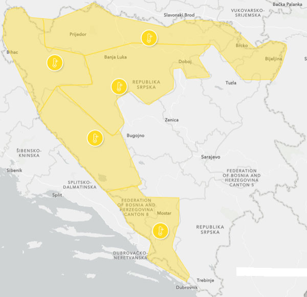 Hidrometeorološki zavodi izdali su žuti meteoalarm za područje Prijedora za ovaj petak, 1. avgust 2025. godine.