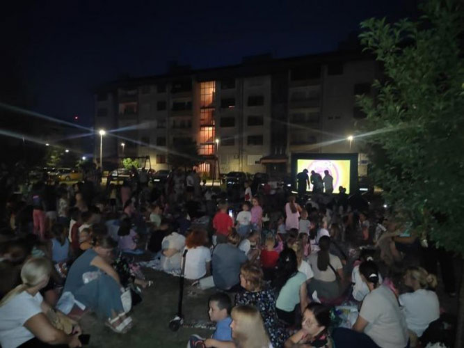 Na jednom od igrališta, između stambenih zgrada, postavljen je projektor, a brojni mališani od kuće su ponijeli dekice i smjestili se da uživaju.