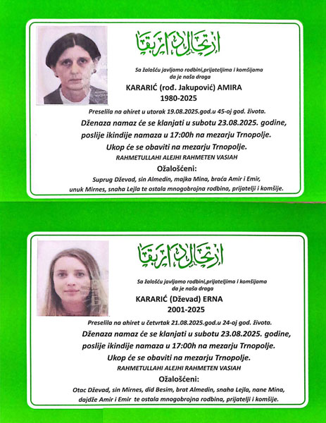 Amira Kararić (45) i njena kćerka Erna Kararić (24) koje su preminule od zadobijenih povreda u teškoj saobraćajki u Trnopolju kod Prijedora u subotu će biti sahranjene na mezarju Trnopolje.