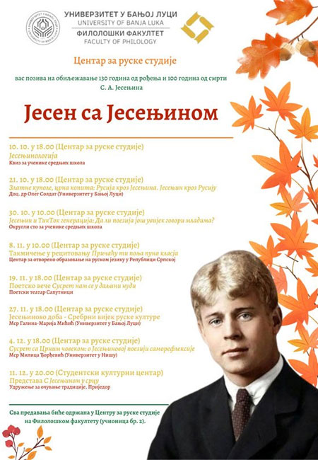 Povodom 130 godina od rođenja i 100 godina od smrti Sergeja Aleksandroviča Jesenjina Centar za ruske studije Filološkog fakulteta Univerziteta u Banaluci organizuje manifestaciju “Jesen sa Jesenjinom”, u okviru koje su predviđene brojne aktivnosti.