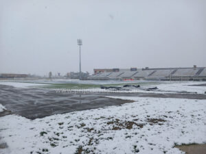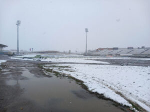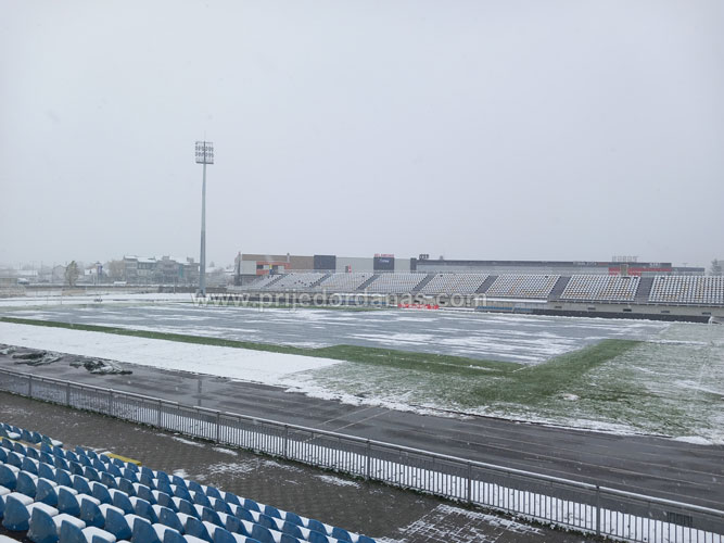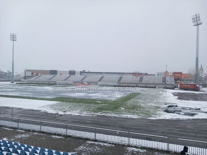Iako su Prijedorčani prethodno travnjak zaštitili najlonom, a danas i krenuli u akciju uklanjanja snijega sa terena, probleme pravi to što snijeg konstantno pada.