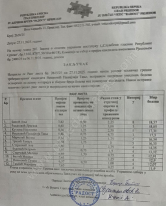 Dječiji vrtić „Radost“ Prijedor potvrdio je autentičnost dviju rang lista rezultata pretposljednjeg konkursa za radna mjesta u ovoj javnoj ustanovi o kojima je portal PrijedorDanas pisao ranije, te ih sada i objavljujemo. Rang liste ustanova objavljuje na oglasnoj tabli.