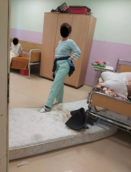 Na jednoj fotografiji, vidno raspoložena i nasmijana higijeničarka pozira s nogom na madracu koji je na podu i vidno prljav dok je u pozadini vidno izmučena starija gospođa.