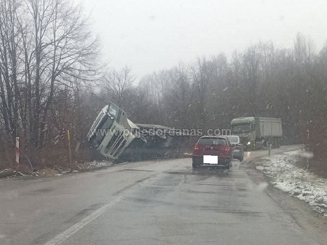 Prema riječima vozača, saobraćaj je usporen na ovom dijelu puta i odvija se jednom kolovoznom trakom s obzirom da se dio kamiona nalazi na cesti.