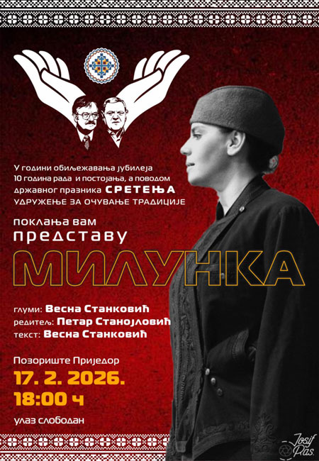 U godini obilježavanja jubileja, 10 godina rada i postojanja, a povodom državnog praznika Sretenja, Udruženje za očuvanje tradicije organizuje izvođenje predstave „Milunka“.