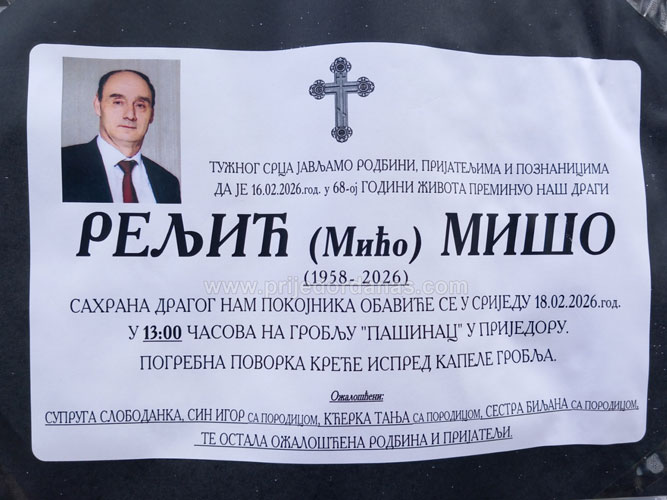Mišo Reljić biće sahranjen sutra u 13.00 časova na groblju Pašinac u Prijedoru.