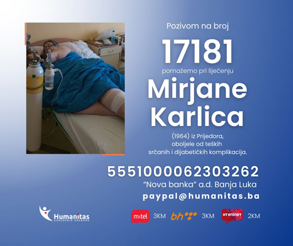 Humanitas pokreće humanitarnu akciju s ciljem prikupljanja sredstava za liječenje Mirjane Karlica (1964) iz Brezičana kod Prijedora, žene koja se već duže vrijeme bori sa teškim i višestrukim zdravstvenim problemima, a istovremeno živi sa minimalnim primanjima.