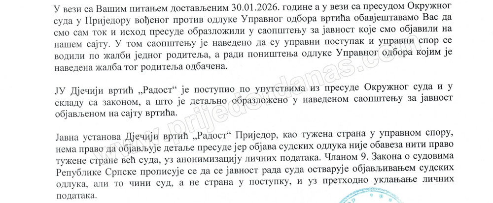 Dva dana kasnije PrijedorDanas objavljuje saopštenje za javnost Dječijeg vrtića “Radost” Prijedor u kojem ustanova navodi “da je rad uprave vrtića transparentan i da vijesti o radu i u vezi sa radom vrtića mogu pratiti na oficijalnom sajtu vrtića”.
