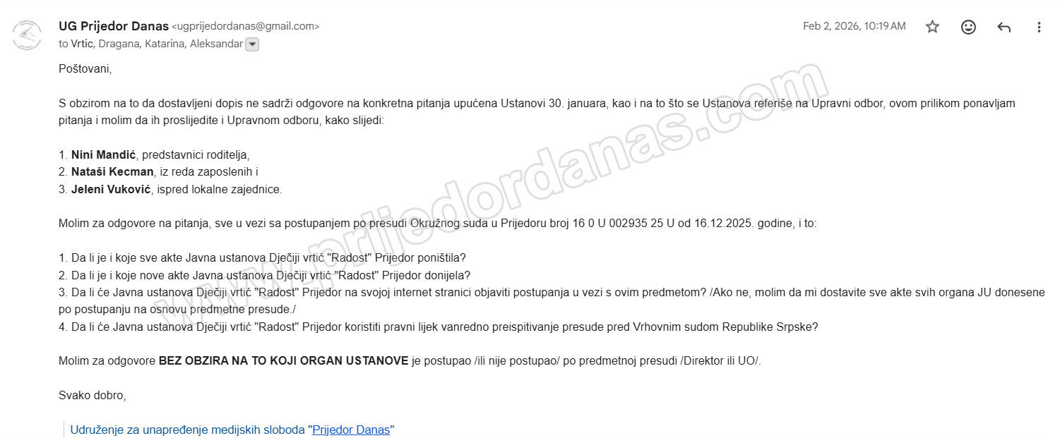 S obzirom na to da je Okružni sud presudu donio 16. decembra, da je potrebno vrijeme da se odluka propisno dostavi stranama, da je ostavljen rok za djelovanje i da je 29. januara ove godine v.d. direktorica Maja Vojnović izlagala Skupštini grada poslovanje ustanove i uspjela ni ne spomenuti ni ovu presudu ni privremeno zatvaranje jaslica, kao da to nisu informacije, a pogotovo presedani, 30. januara vrtiću smo uputili pitanja u vezi sa postupanjem po presudi: