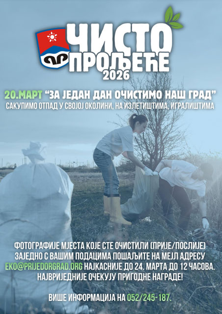Akciju “Čisto proljeće” Gradska uprava Prijedor realizuje povodom prvog dana proljeća i Svjetskog dana šuma, a s ciljem uticaja na ekološku svijest.