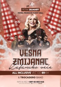 Kako najavljuju organizatori, uz legendarnu Vesnu Zmijanac i njene vanvremenske hitove “Kad zamirišu jorgovani”, “Istina”, “Nevera moja”, “Svatovi”, “Kunem ti se životom” i mnoge druge očekuje vas sjajan provod i nezaboravno veče.