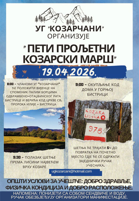U organizaciji Udruženja građana “Kozarčani” iz Bistrice kod Prijedora u nedjelju, 19. aprila 2026. godine, biće održan “Peti proljetni kozarski marš”