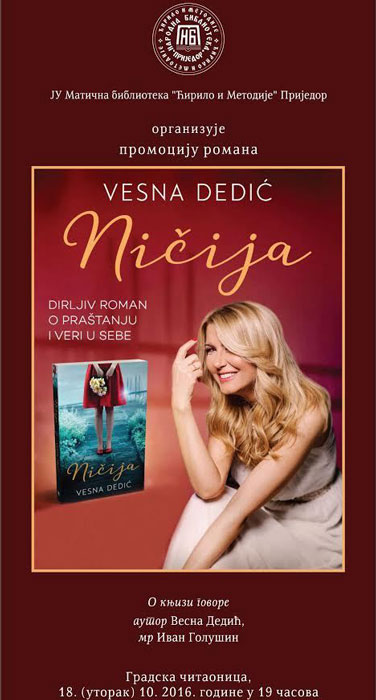 JU Matična biblioteka “Ćirilo i Metodije” Prijedor organizuje ovog utorka, 18.oktobra, promociju novog romana Vesne Dedić “Ničija”.