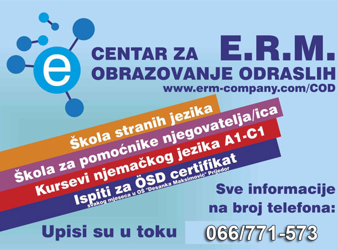 Za sve ostale informacije možete se obratiti u prijedorskoj kancelariji Centra za obrazovanje odraslih E.R.M. koja se nalazi u ulici Miloša Obrenovića br.6 ili na brojeve telefona: 037/511-911, 066/771-573.