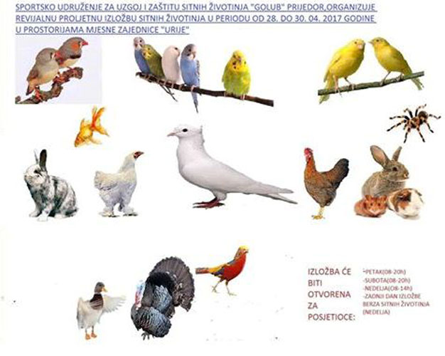 -Nakon ponovnog aktiviranja rada Društva i uspješno realizovanih aktivnosti tokom protekle dvije godine, ponovo organizujemo Revijalnu proljetnu izložbu sitnih životinja. Izložba će biti otvorena u petak i subotu od 8:00 do 20:00 časova. Za nedjelju je predviđena berza životinja i kućnih ljubimaca koja će trajati do 14:00 časova kada planiramo zatvaranje – potvrdio je Branko Stojanović, sekretar „Goluba“.