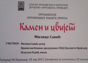 Srpsko prosvjetno i kulturno društvo „Prosvjera“ Prijedor organizuje večeras promociju knjige priča „Kamen i cvijet“ autorke Milice Savić.