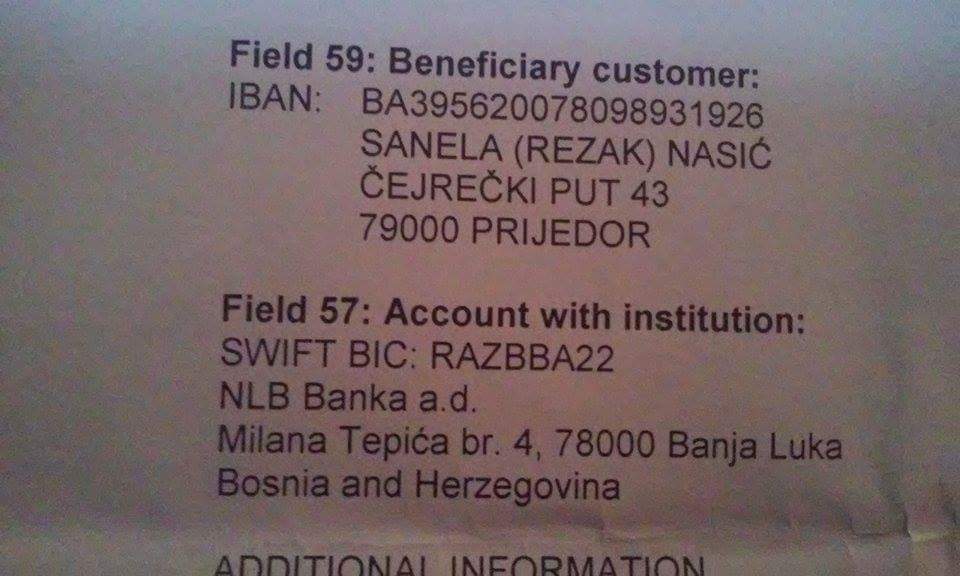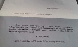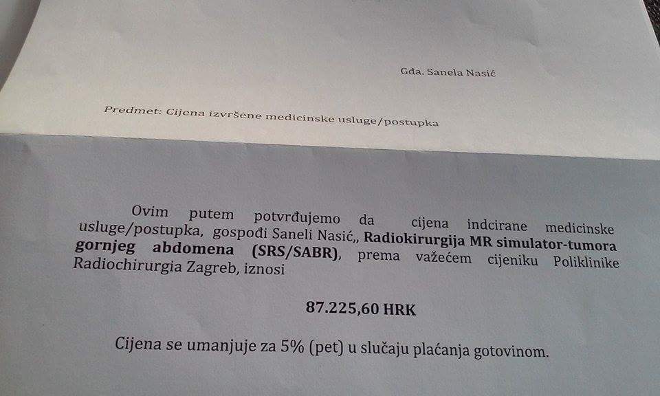 Saneli je ispostavljen predračun za operativni zahvat koji bi trebao biti obavljen u roku deset dana, od kojih je već nekoliko prošlo u šutnji i bolu. Sanela se nalazi u ćorsokaku i nikoga ne pita jer kaže da ju je sram obzirom da su to velika sredstva. Ali sve vas koji danas žurite da možda uknjižite ovogodišnji godišnji odmor na nekoj poznatoj destinaciji ili možda kupite neku markiranu stvar ili jednostavno želite sebi prirediti ono što svaki normalan čovjek jednostavno želi, bolji život…MOLIMO VAS pritisnite kočnicu i obećajte sebi da ćete se možda nečeg odreći i dio vaših planiranih sredstava odvojiti za spašavanje života naše Sanele. Naš grad treba ljude a posebno porodice i ljude poput Sanele i njenog supruga, vrijedne. Sanela u najvećoj bolesti obrađuje plastenik i ovih dana pokušava rasprodati jagode koje su dospjele u njenom plasteniku. Ona želi da iz ove borbe iziđe kao pobjednik. Bez vas neće uspjeti. Vjerujemo da ćemo zajedno narednih dana uspjeti sakupiti 87.225,60 hrvatskih kuna, odnosno 12.000 eura neophodnih za njenu operaciju.