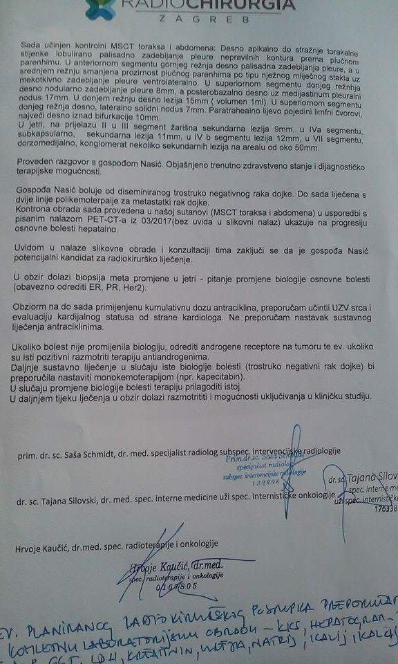 Pisali smo već o našoj sugrađanki Saneli Nasić iz Čejreka kod Prijedora. Ona se već nekoliko godina bori sa karcinomom koji je ne ostavlja na miru ali Sanela se baš zainatila zajedno sa svima vama koji ste već pomagali finansijski u toj borbi. Međutim, u zadnje vrijeme karcinom se ne šali, sve je zločestiji a Sanela sve umornija. Posljednji nalazi koje je obavila na Radiochirurgiji u Zagrebu- poliklinici za radioterapiju, onkologiju i radiologiju su zabrinjavajući.