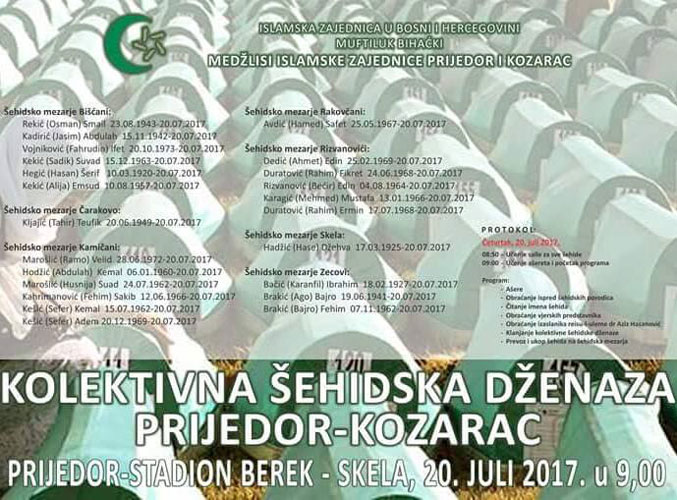 Ovogodišnja kolektivna dženaza i ispraćaj posmrtnih ostataka Prijedorčana stradalih u proteklom ratu biće održani na stadionu “Poljana” (Berek) u prijedorskom naselju Raškovac, ovoga četvrtka, 20. jula sa početkom u 9:00 časova.