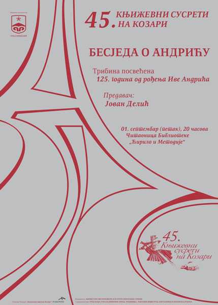 Tribina je naslovljena “Besjeda o Andriću”, govoriće prof. dr Јovan Delić, a ova manifestacija je dio programa 45. Književnih susreta na Kozari.