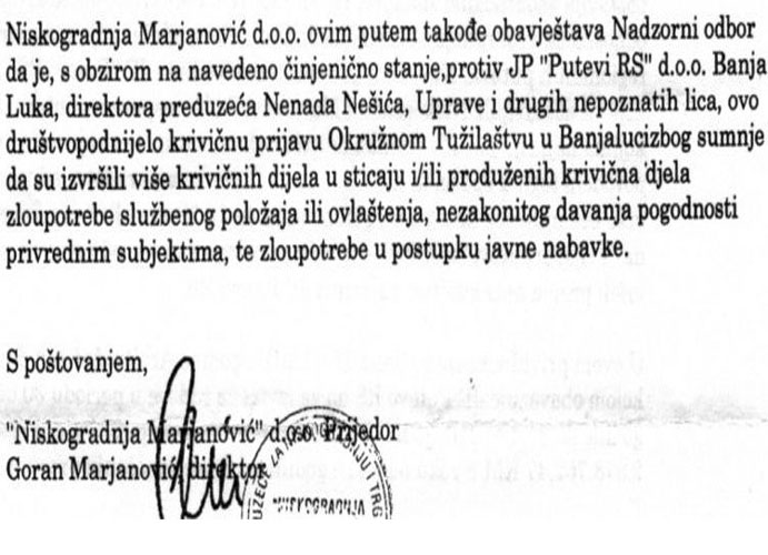 Inače, „Niskogradnja Marjanović“ prije nekoliko mjeseci uputila je dopis Nadzornom odboru „Puteva RS“ u kojem je navela da je podnijela krivičnu prijavu. U dopisu koji je u posjedu CAPITAL-a, navodi se da je Nešić na sve načine pokušavao milionski vrijedan posao održavanja puteva da da firmama „Kozaraputevi“ i „Prijedorputevi“.
