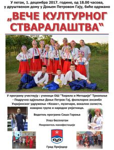 Ovoga petka, 1. decembra, od 18 časova u društvenom domu u Donjem Petrovom Gaju biće održano „Veče kulturnog stvaralaštva“.